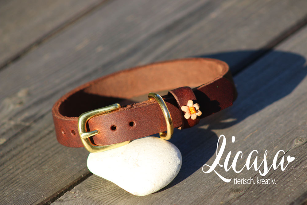 Es stehen verschiedene Breiten und Größen zur Wahl, ebenso kann das "Innenleben" der naturbelassenen Blümchen aus Blankleder farblich gewählt werden.