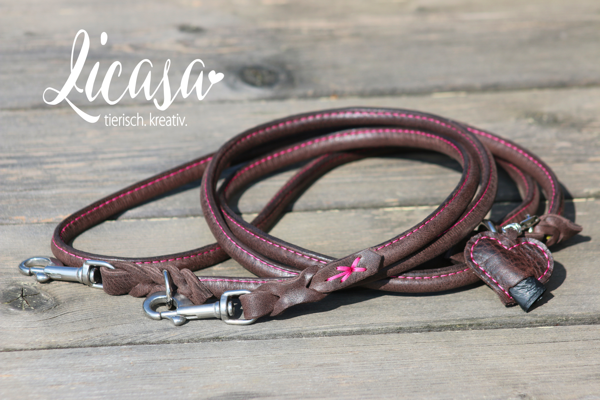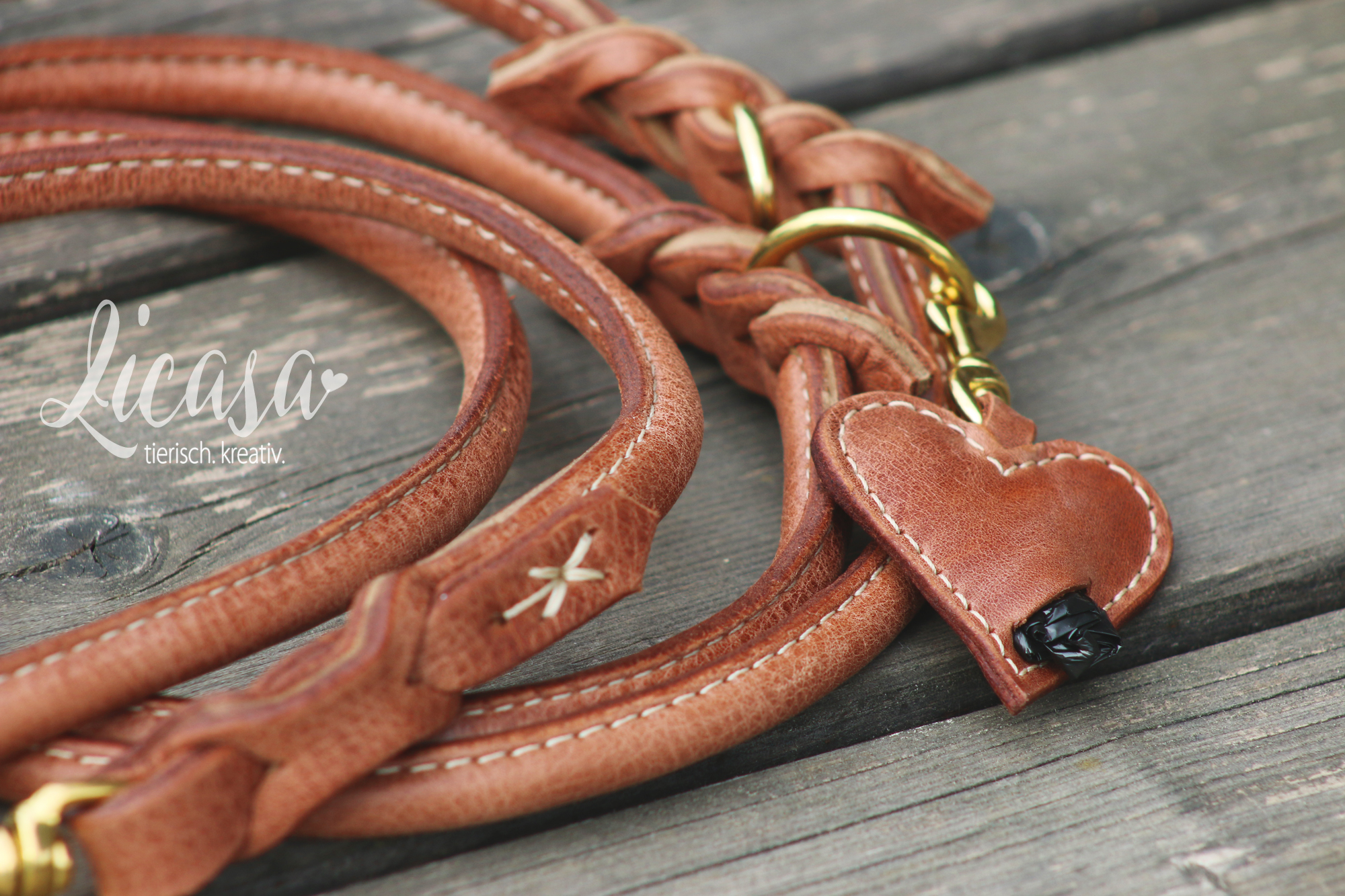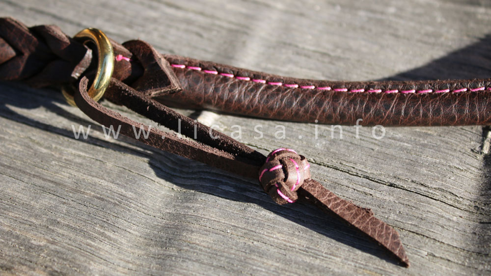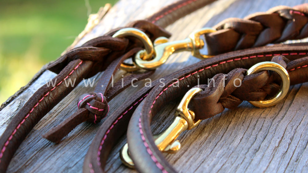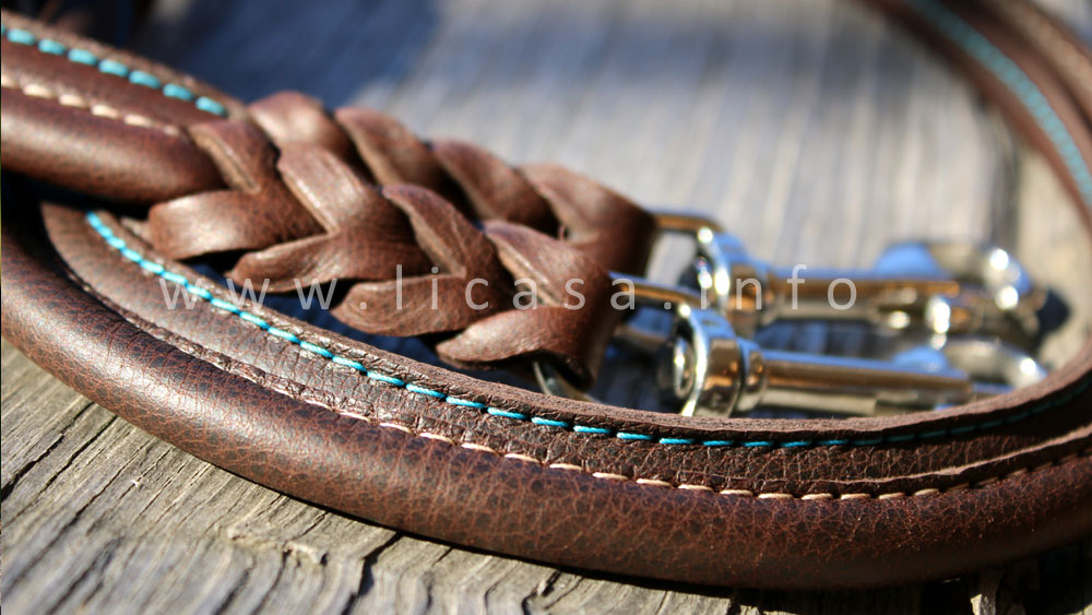 In sachkundiger Handarbeit mit viel Liebe und Sorgfalt zum Detail werden diese einzigartigen, Leinen aus ausgewähltem, fettgegerbtem Rindleder in der gewünschten Länge gefertigt. Alle Teile sind hochwertig genäht und verarbeitet, ebenso werden Beschläge (Ringe & Bolzenkarabiner) aus rostfreiem Edelstahl oder Messing verwendet.