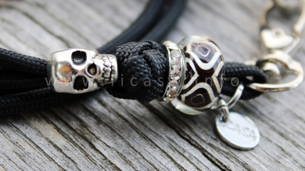 Es fällt sehr schön und liegt angenehm auf der Haut. Als Highlight wurden eine Totenkopfperle über dem dekorativen Knoten und darunter ein funkelnder Strassring mit einer Acrylpere eingearbeitet. Das Muster der Perle kann variieren. Skull ist in 3 verschiedenen Längen und 41 Farben erhältlich.