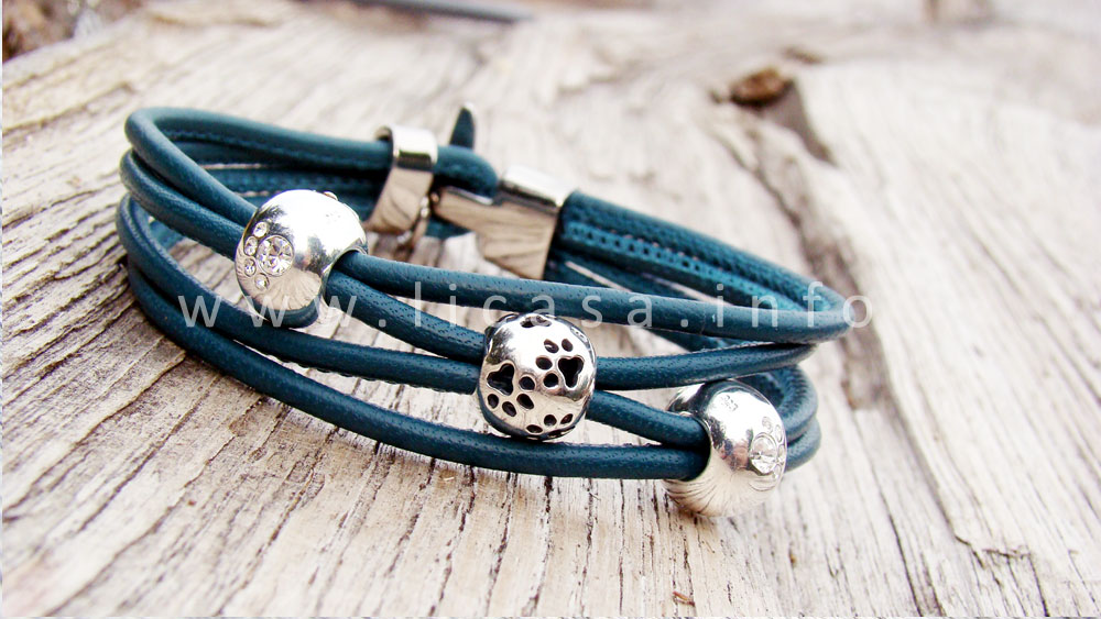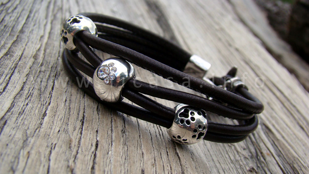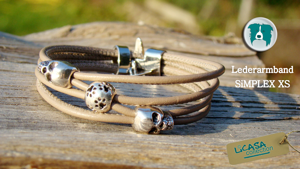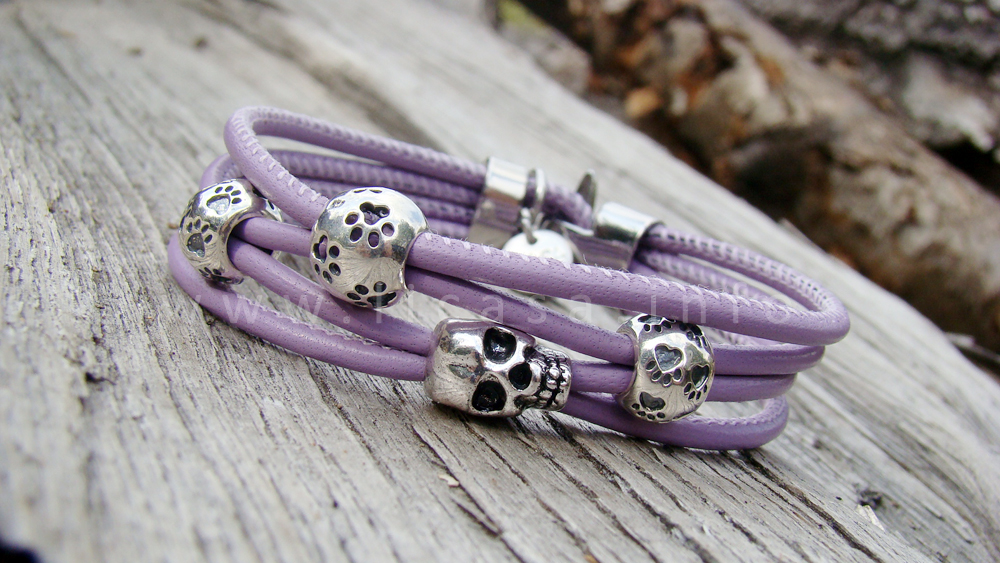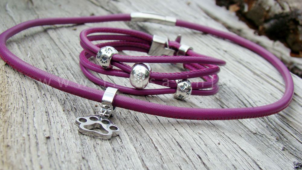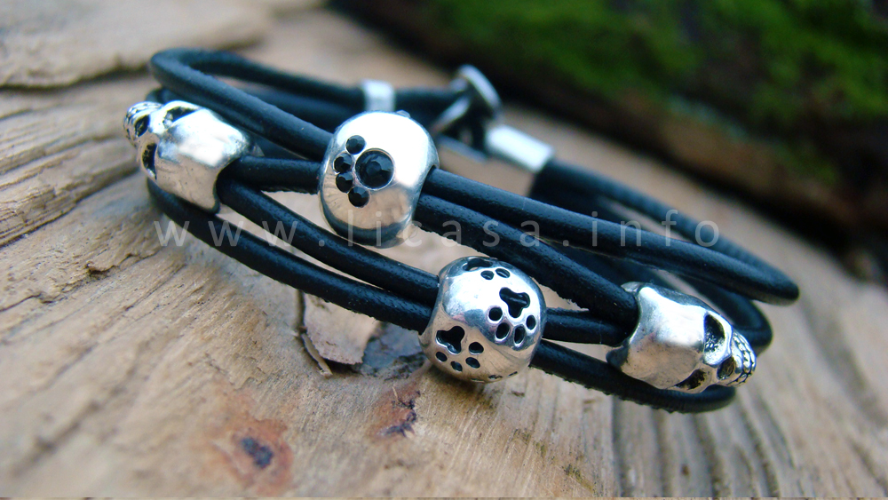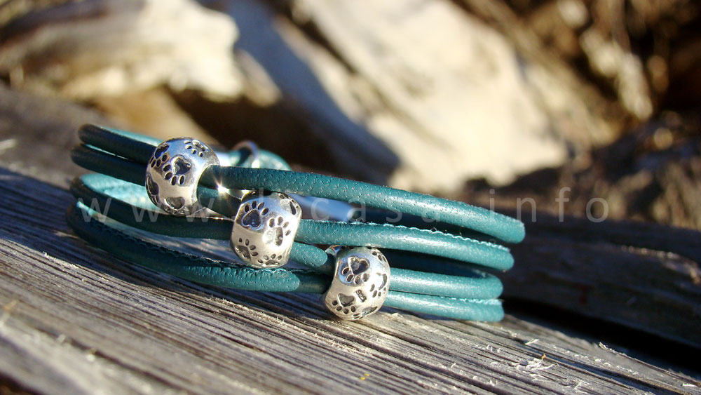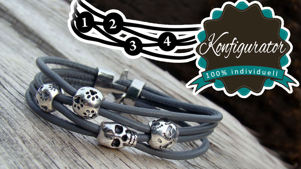 Wählen Sie Ihre Lieblingsfarbe aus vielen Lederfarben und bestücken Sie Ihr Armband wahlweise mit Totenkopf und/oder 925er Sterling Silber Pfotenperlen.