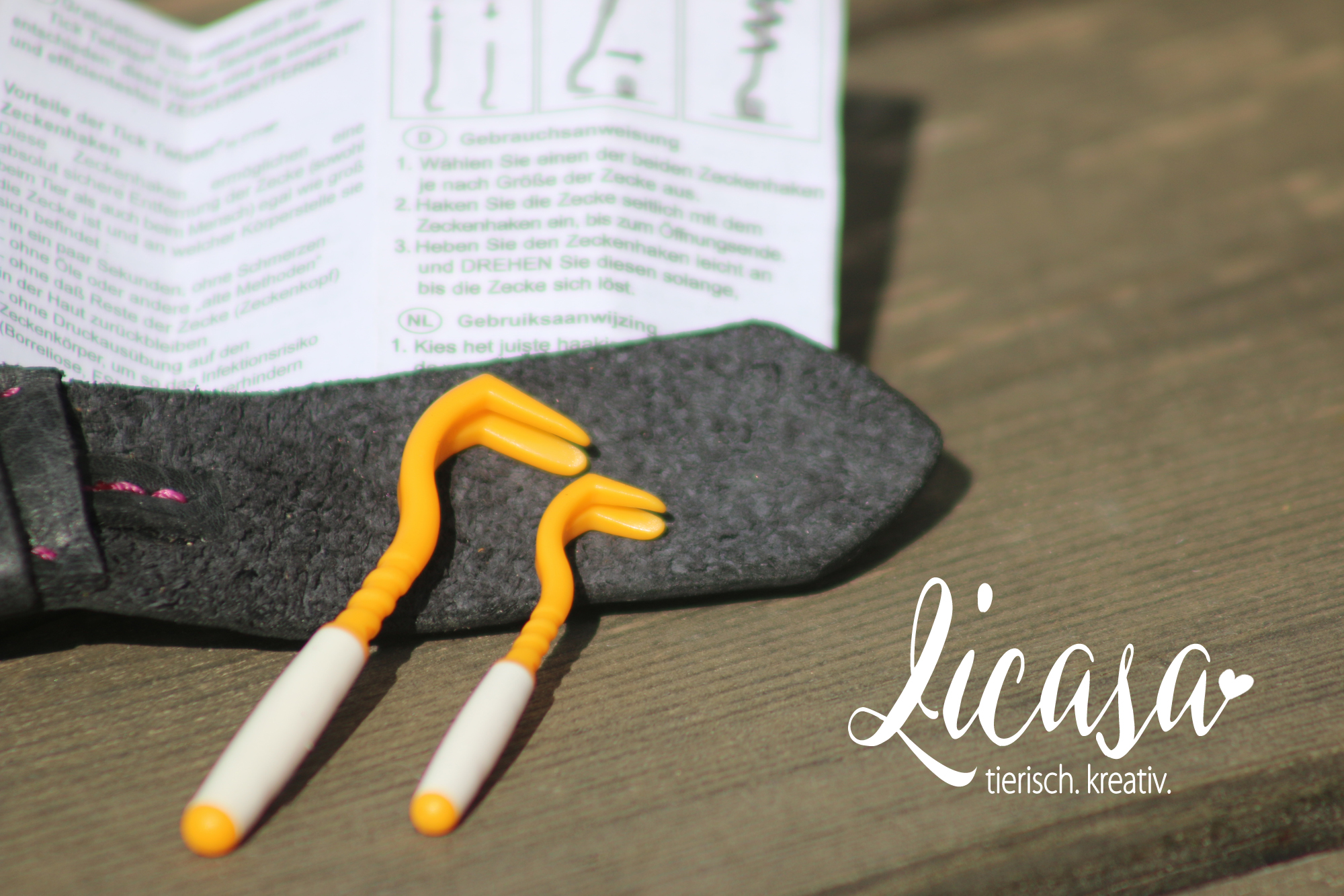 Die Farbe der Zeckenhaken kann abweichen. Sie werden möglichst passend zum Anhänger gewählt.