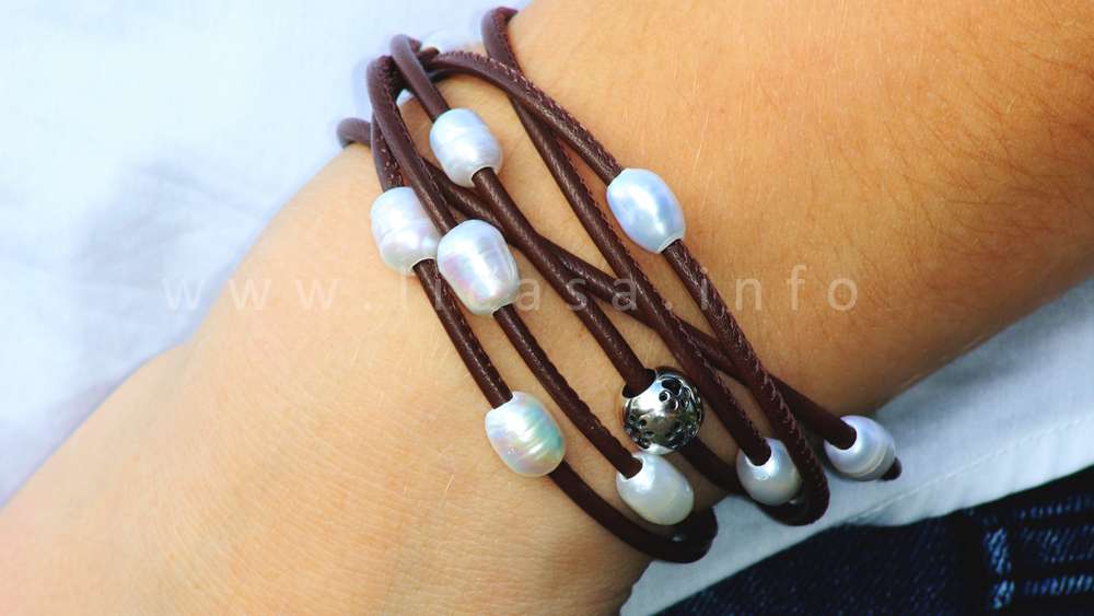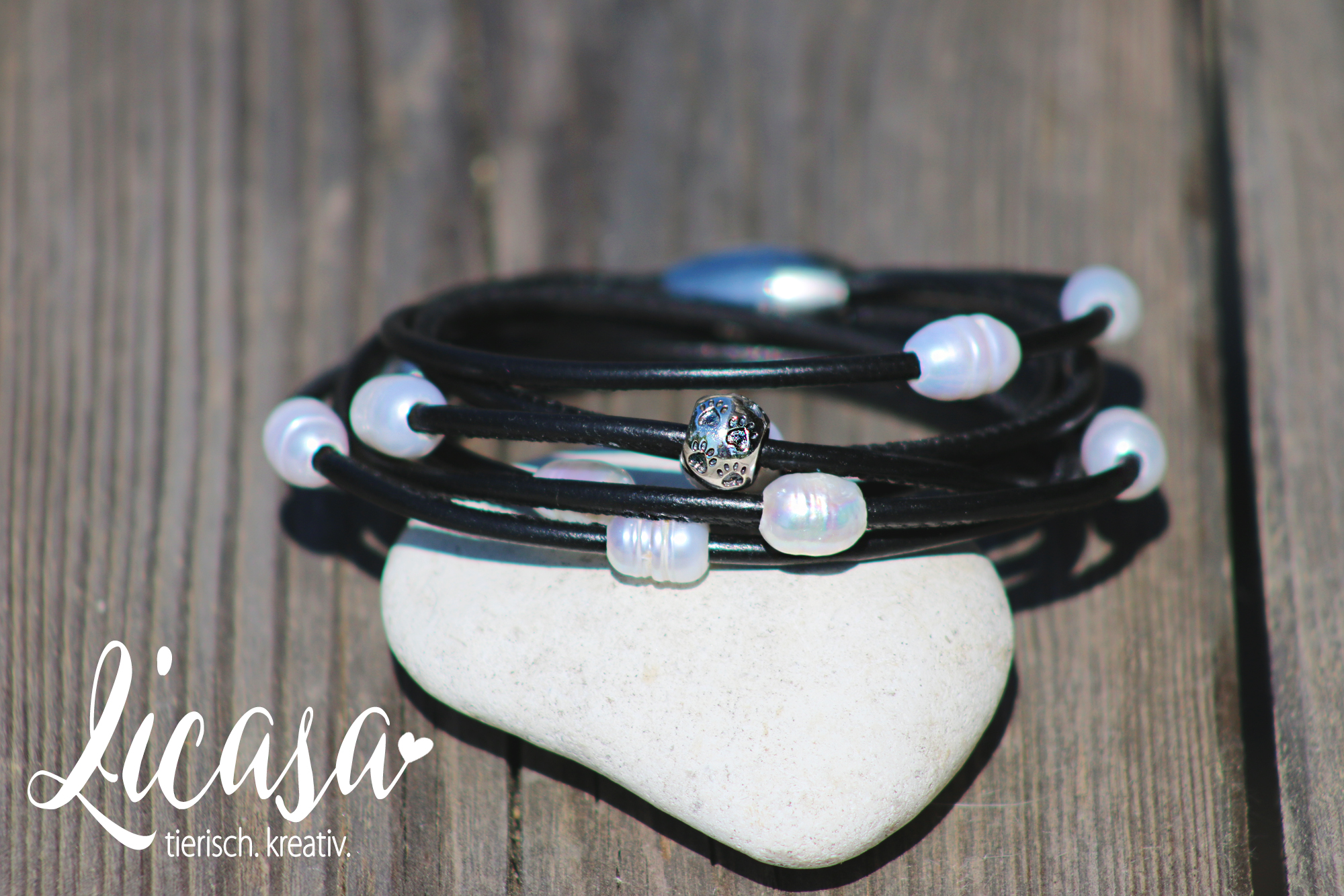 Schimmernde Süßwasser-Zucht-Perlen sind auf weichem, gesäumten Nappaleder aufgereiht. Einmal gewickelt, ergeben sich 6 Stränge, die mit einer Edelstahl-Magnet-Schließe einfach und sicher geschlossen werden. Es können zusätzlich bis zu 5 hochwertige 925 Sterling Silber Perle mit Pfotenmotiv eingearbeitet werden, die geprägten Pfötchen sind auch in der vergoldeten Version möglich.