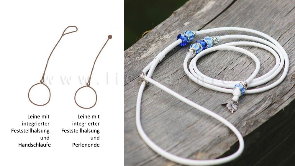 Diese Showleine ist mit Feststellhalsung und wahlweise mit Handschlaufe oder Perlenende erhältlich.